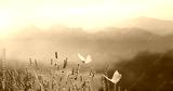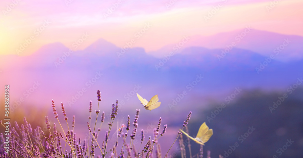 Blooming lavender spring flower and a flying butterfly against the backdrop of a spring sunrise landscape