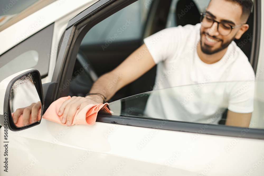Indian man polishing inside his white car with a rug