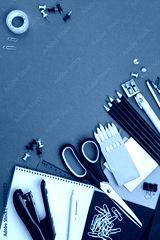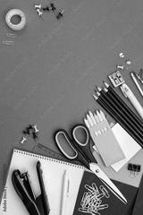 stationery items around of image on green background. Back to school background, banner with copy space. Student's or engineer's supplies. Office objects on dark green background. Calculator, keyboard