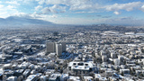 Aerial drone photo of Kifisias avenue and urban area of Marousi covered in snow, Athens, Attica, Greece