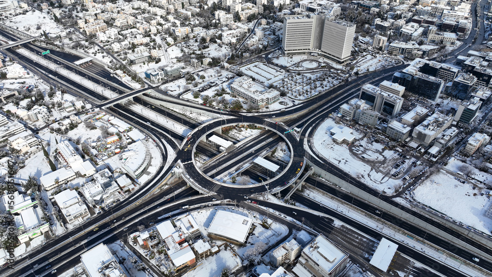 Aerial drone photo of urban elevated toll ring road junction and interchange overpass covered in snow during winter time