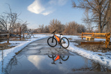 mountain bike on Poudre River Trail near Greeley in Colorado, winter scenery with puddle reflection