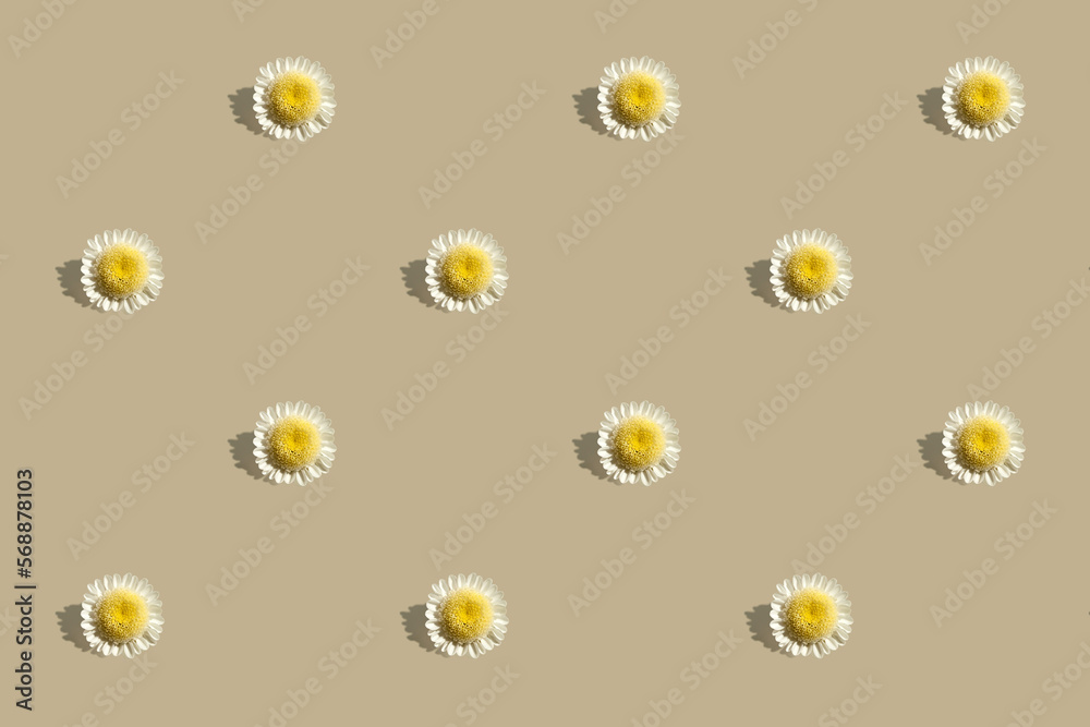 Pattern from chamomile flowers on beige background. Summer, spring, holiday floral concept. Banner. Camomile, daisy. Mother day. Design for wrapping paper, cards. Seamless pattern for wallpaper