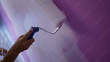 Closeup paint roller on purple wall applying white color. Person doing home renovation