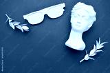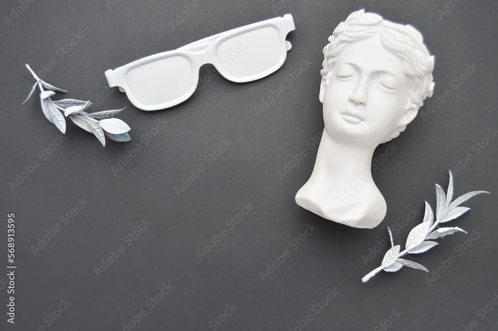 plaster head of venus, leaves, sunglasses Place for text. Wallpaper, black background. Place for text