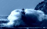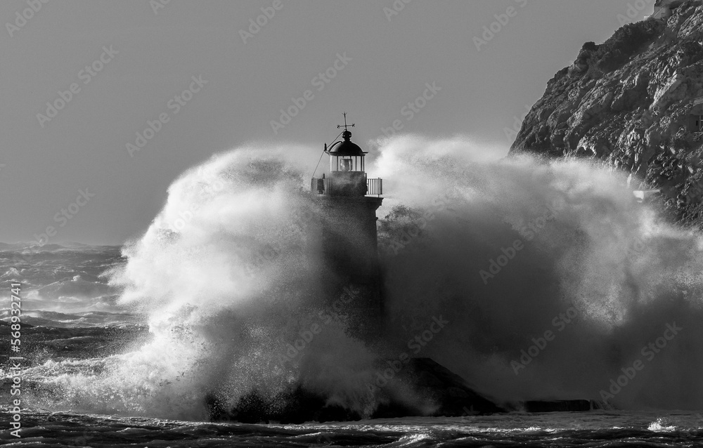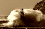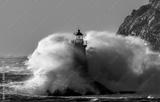 storm on the sea with a huge waves crashing into a lighthouse covering it almost completely