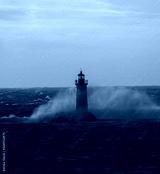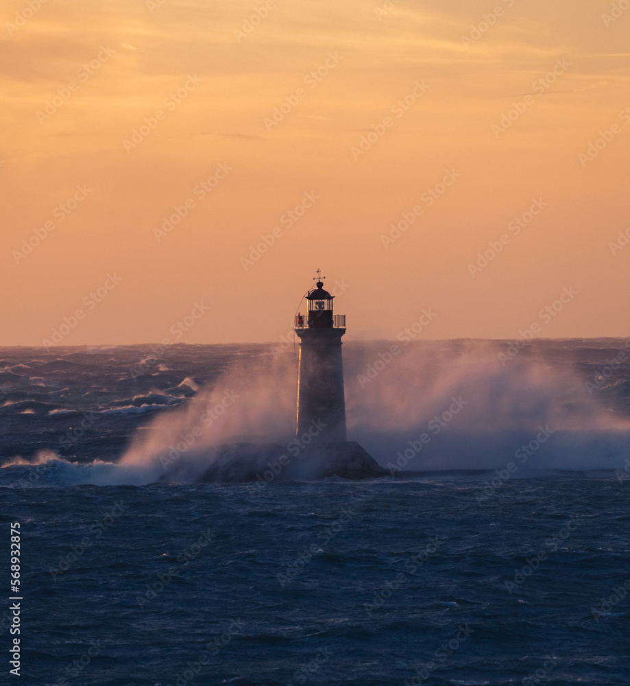 stormy weather, the rough sea are clashing into the lighthouse, during the sunset