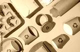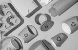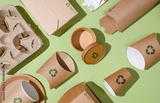 Disposable eco-friendly packaging with a recycling sign on a green background. Reusable raw materials.