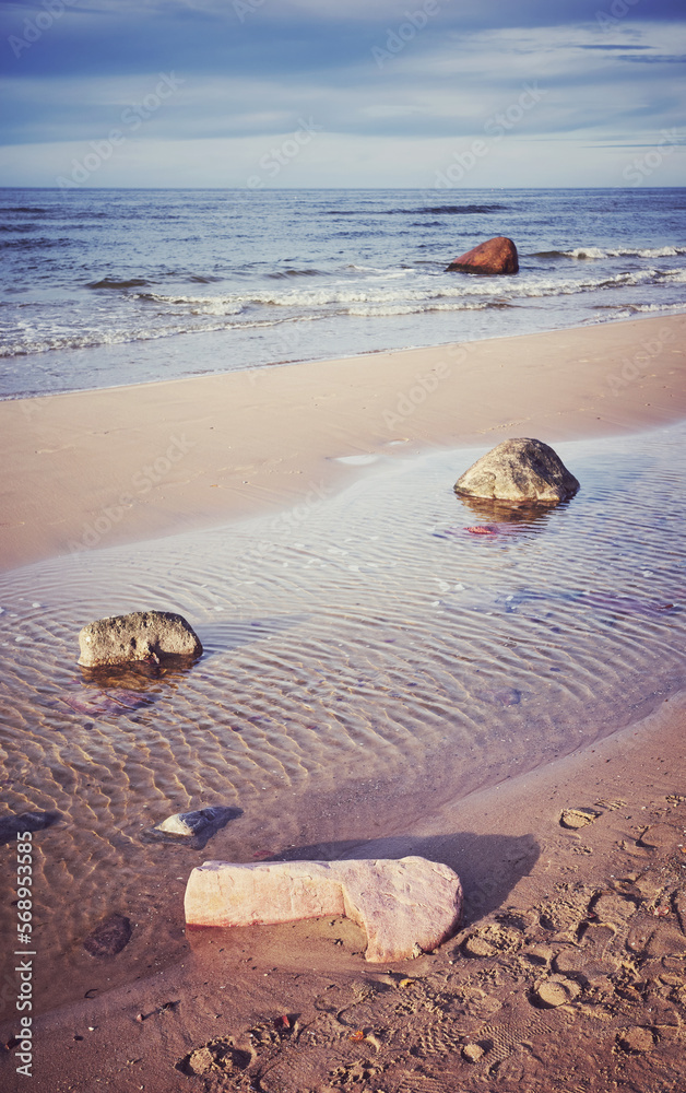 Baltic sea beach at sunset, front focus, color toning applied, Miedzyzdroje, Poland.