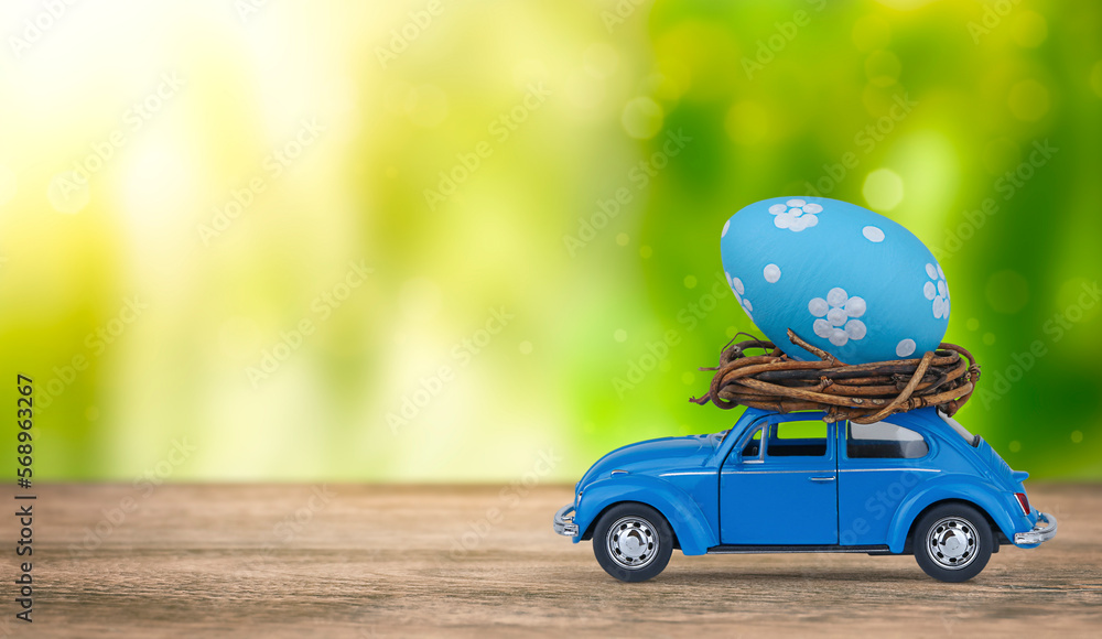 Retro toy car carrying an Easter egg on the roof. Easter concept