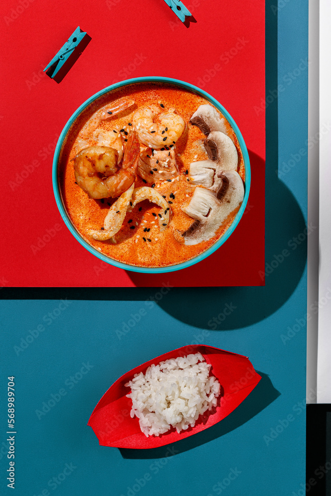 Tom yum soup with shrimps and rice in blue pastel color boul at blue and red background with sunlight and shadows, minimalism,top view