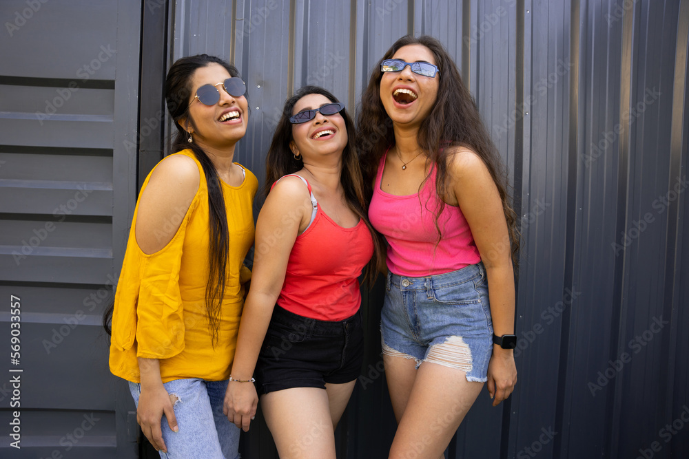Portrait of beautiful indian women having fun party,Group of young girl friends in sunglasses and casual clothes , laughing and celebrating all together. summer vacation.