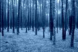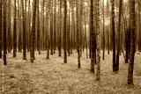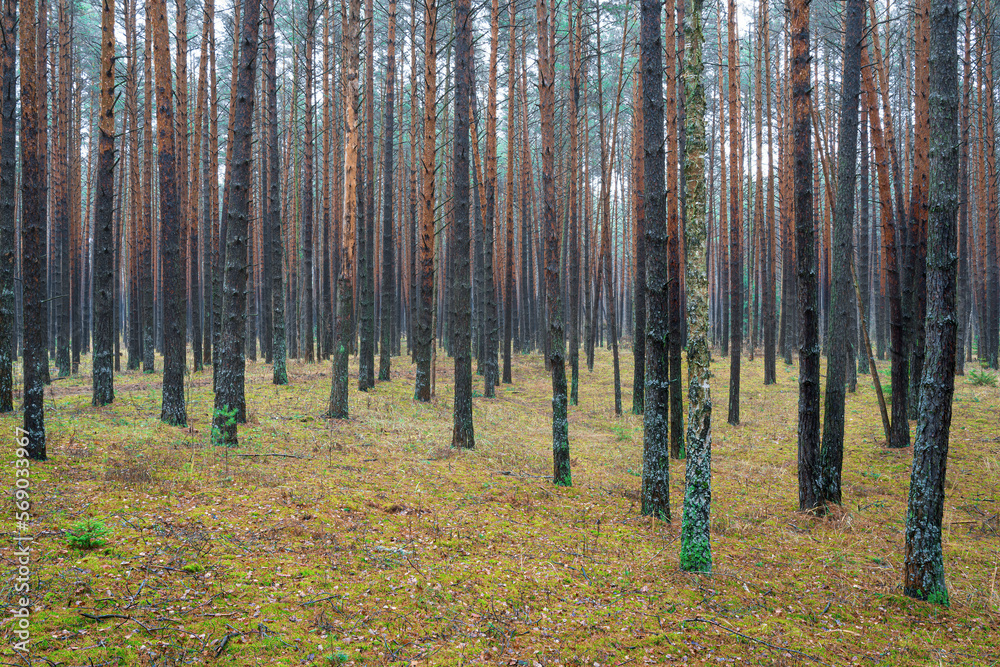 Pine autumn misty forest. Rows of pine trunks shrouded in fog on a cloudy day.