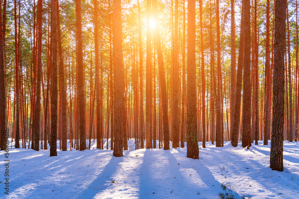 Sunset or sunrise in the spring pine forest covered with a snow. Sunbeams shining through the tree trunks.