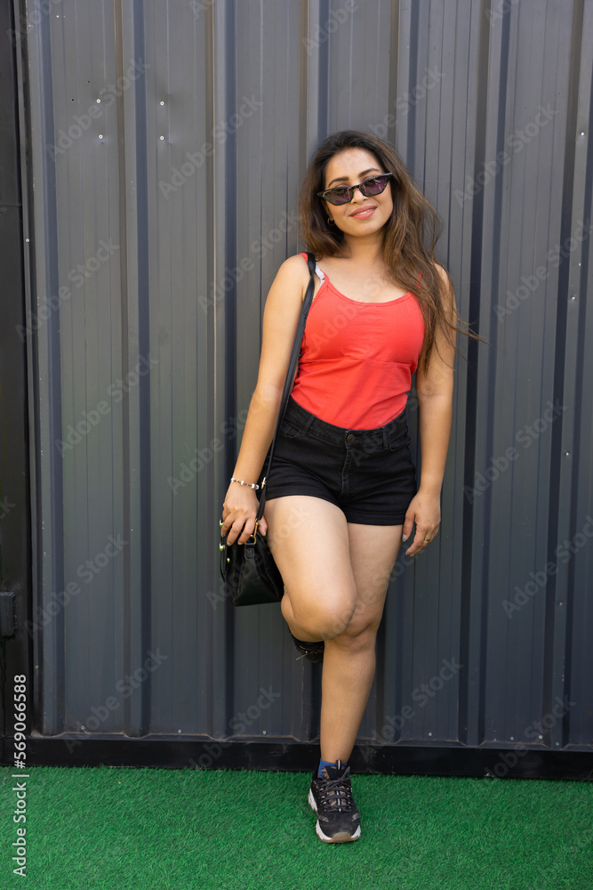 Young attractive fashionable indian woman wearing casual short outfit and sunglasses holding handbag standing outdoor. Copy space.