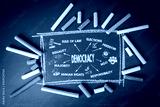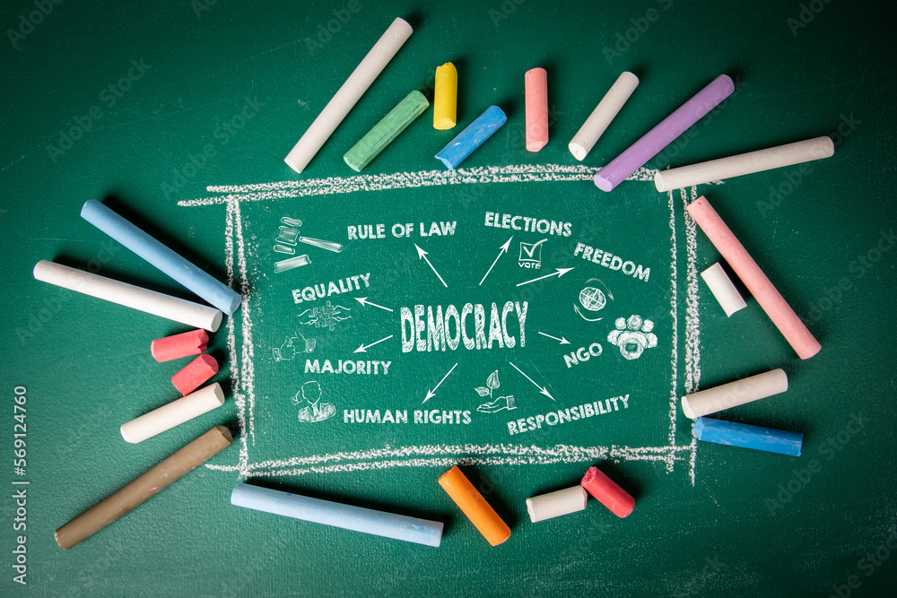Democracy concept. Chart with keywords and icons. Green chalkboard