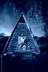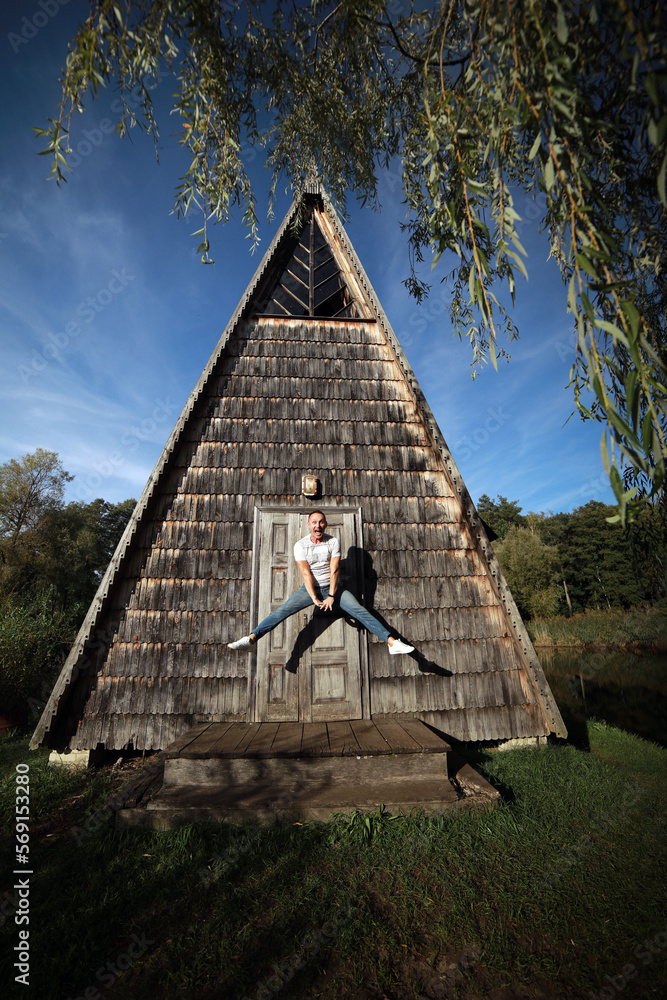 Young funny man jumping at the countryside by the rustic old building and pond. Guy wearing casual clothes taking a great leap. Summer travel holidays, fun and freedom concepts.