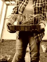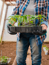 Human hands of a farmer plant pepper sprouts in a greenhouse. The concept of farming and planting.
