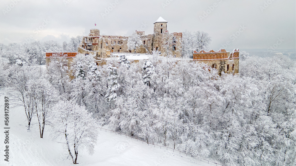 Tenczyn castle in Rudno in winter surrounded by snowy trees.