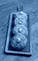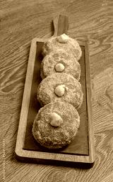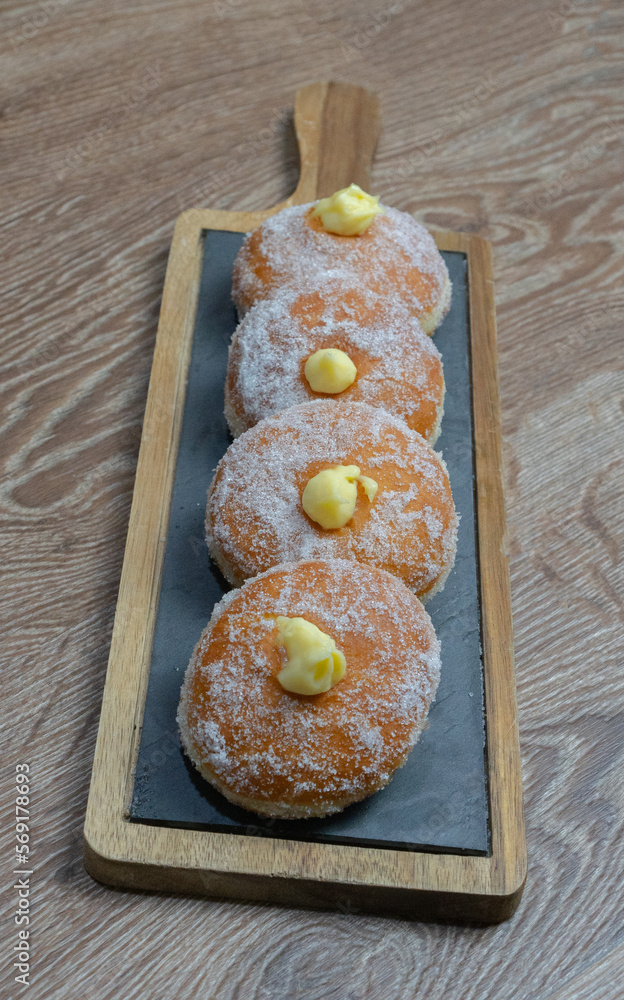Homemade fried donuts filled with custard and seasoned with a veil of sugar