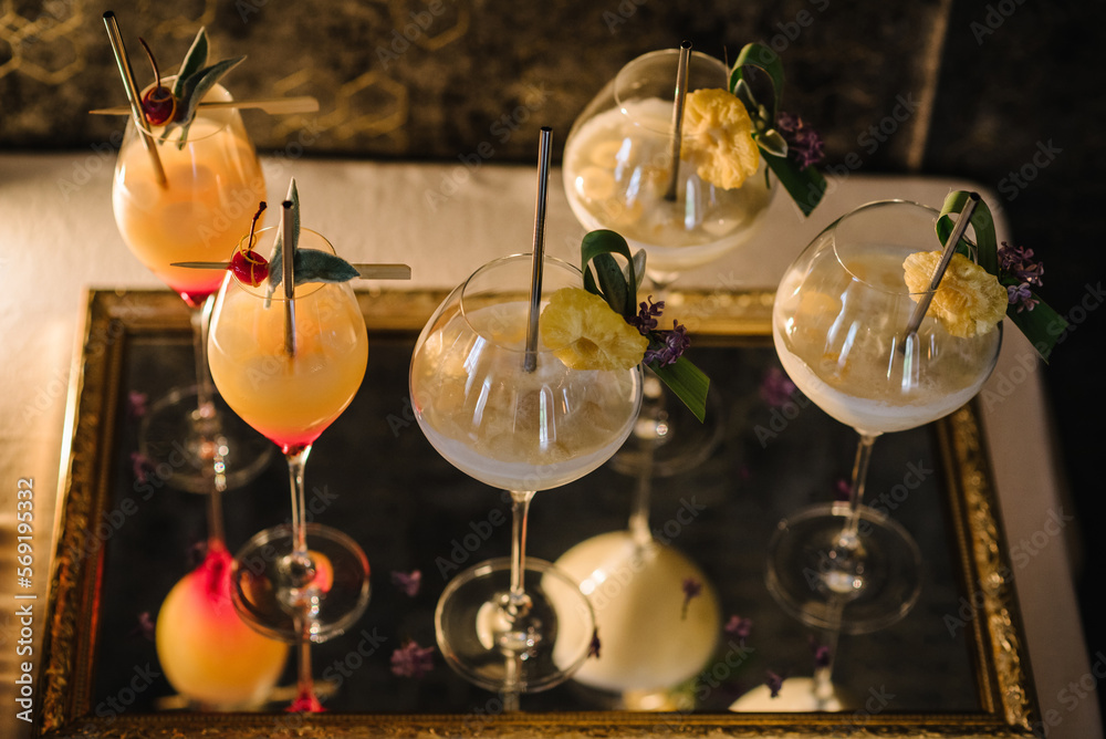 Set of classic cocktails. Pina Colada cocktail with a slice of pineapple on the bar. Fresh alcoholic Tequila Sunrise with cherry. The concept of summer vacation, and drinking cocktails. Top view.