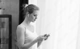 Young woman in white underwear is standing in front of the window and looking into it. Girl at home in the living room.