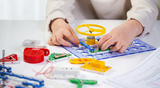 Close-up of children's hands launching a propeller on an electronic construction kit. Future engineer learns to assemble electronic circuits. Creative hobby. New skills