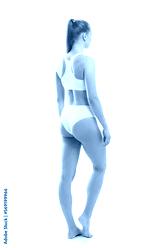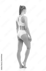 Young, fit and beautiful blond woman in white swimsuit isolated on grey background. Healthcare, diet, sport and fitness concept.