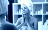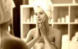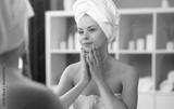 Young woman sits in the bathroom in front of the makeup mirror and does cosmetic procedures. Beautiful girl in white towel. Skin care, health, rejuvenation and spa treatment concept.