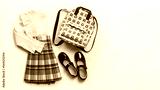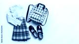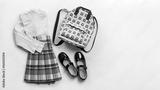 Girls clothes, primary or elementary school uniform, white blouse and plaid skirt, black shoes, backpack on white background. Copy space.