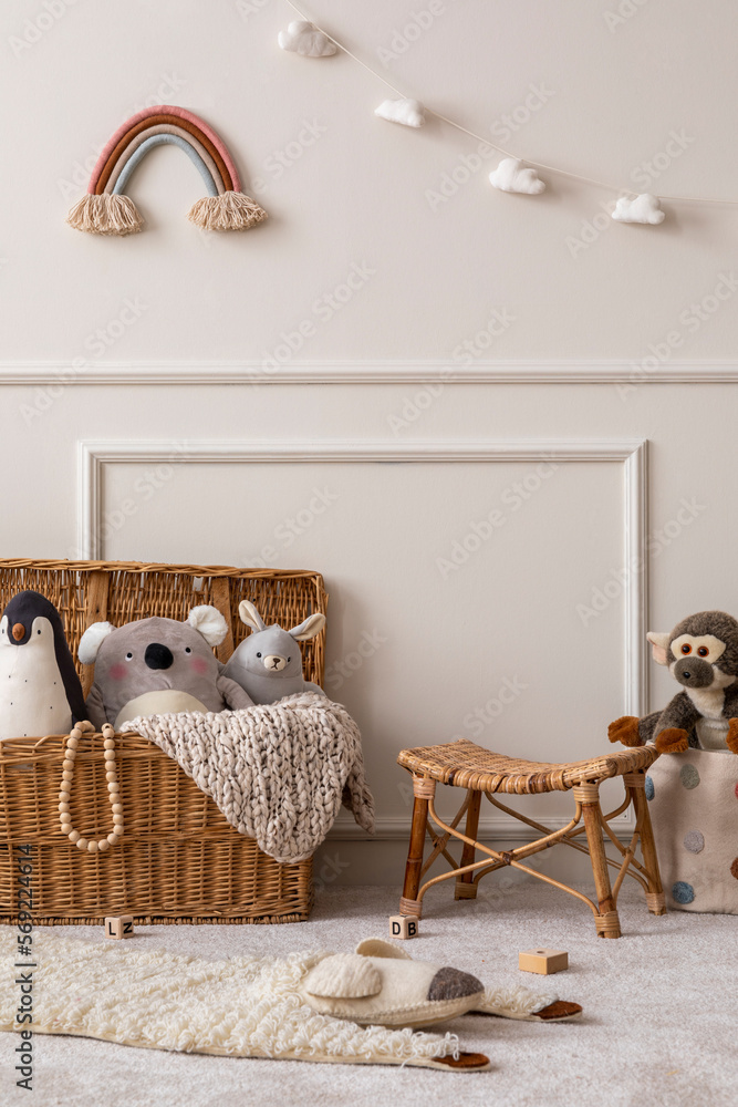Interior design of kids room interior with wicker basket, plush animal toys, poster, wooden blockers, ladder, white stool, beige wall with stucco and personal accessories. Home decor. Template.