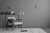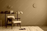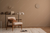 Creative composition of living room interior with copy space, boucle armchair, brown pillow, sideboard slippers, beige rug, vase with dried flowers and personal accessories. Home decor. Template.