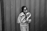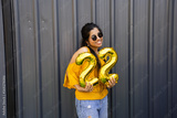 Cheerful beautiful young indian girl wearing casual cloths and sunglasses holding golden balloon number twenty two.