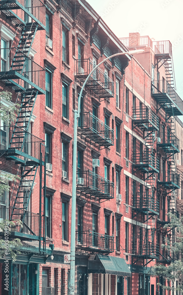 Old brick townhouses with fire escapes, color toning applied, New York City, USA.