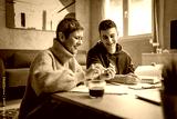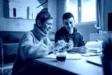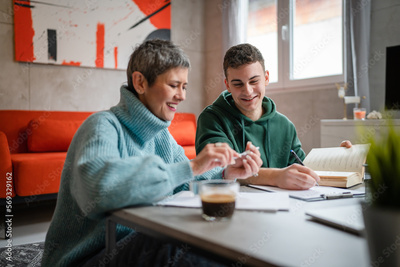 One student teenage caucasian man study learn with help of his tutor professor or mother senior woman at home having private lesson to prepare for exam education concept real people copy space
