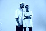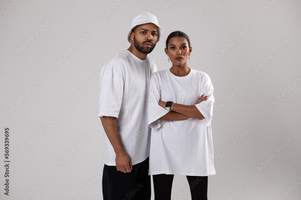 African american couple in white t-shirts. Man in white panama. Mock-up.