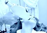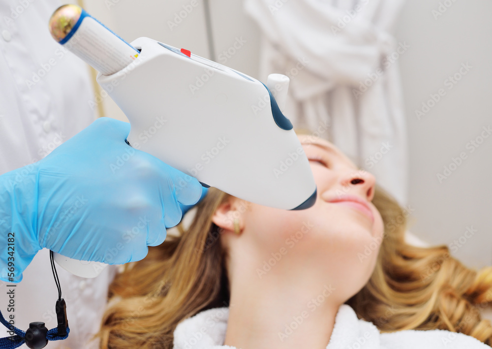 procedure of hardware skin rejuvenation using a cold stream of carbon dioxide CO2. A cosmetologist performs a skin rejuvenation procedure for an attractive woman