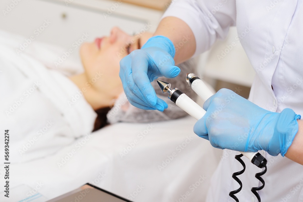 cosmetologist conducts microcurrent facial therapy for a young woman using a device in a beauty salon. Hardware cosmetology, skin care, rejuvenation, regeneration.