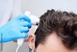 Close-up cosmetologist trichologist diagnoses the condition of the hair of a male patient with baldness using trichoscopy.