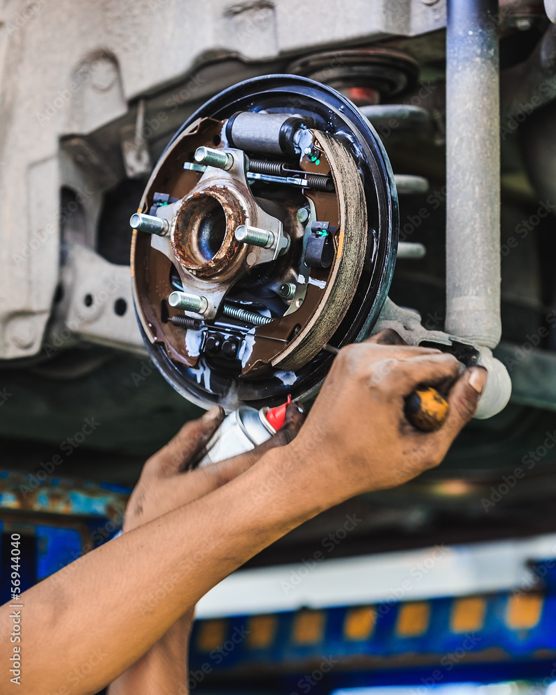 Hands of a mechanic adjusting a car drum brake
