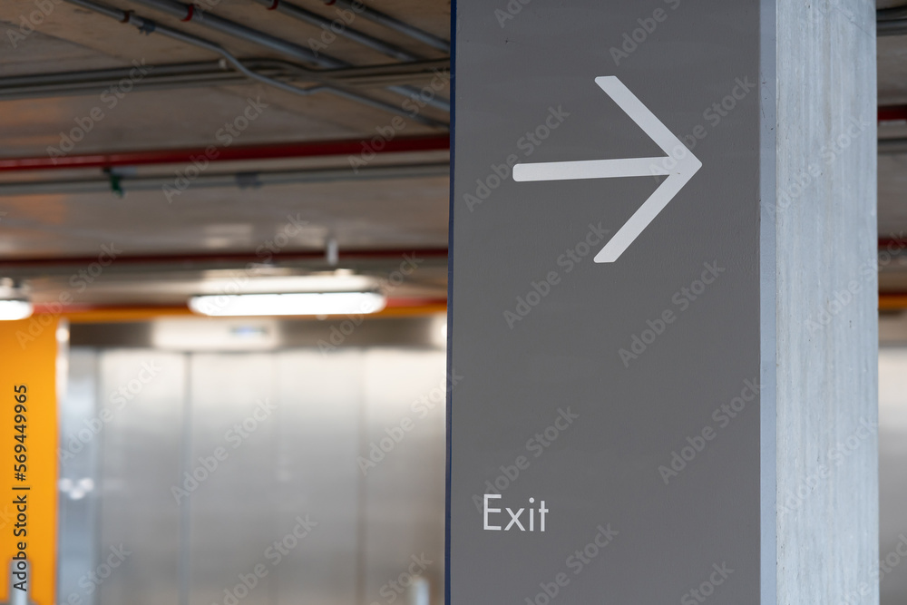 Arrow pointing to the exit on the pole. Exit Sign, Metal Exit Sign, Parking Exit in Condo. Symbol. copy space. selective focus.