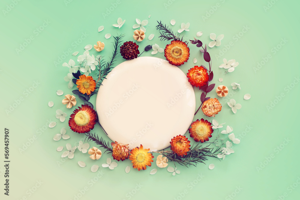 Top view image of Helichrysum bracteatum dry flowers over mint background .Flat lay