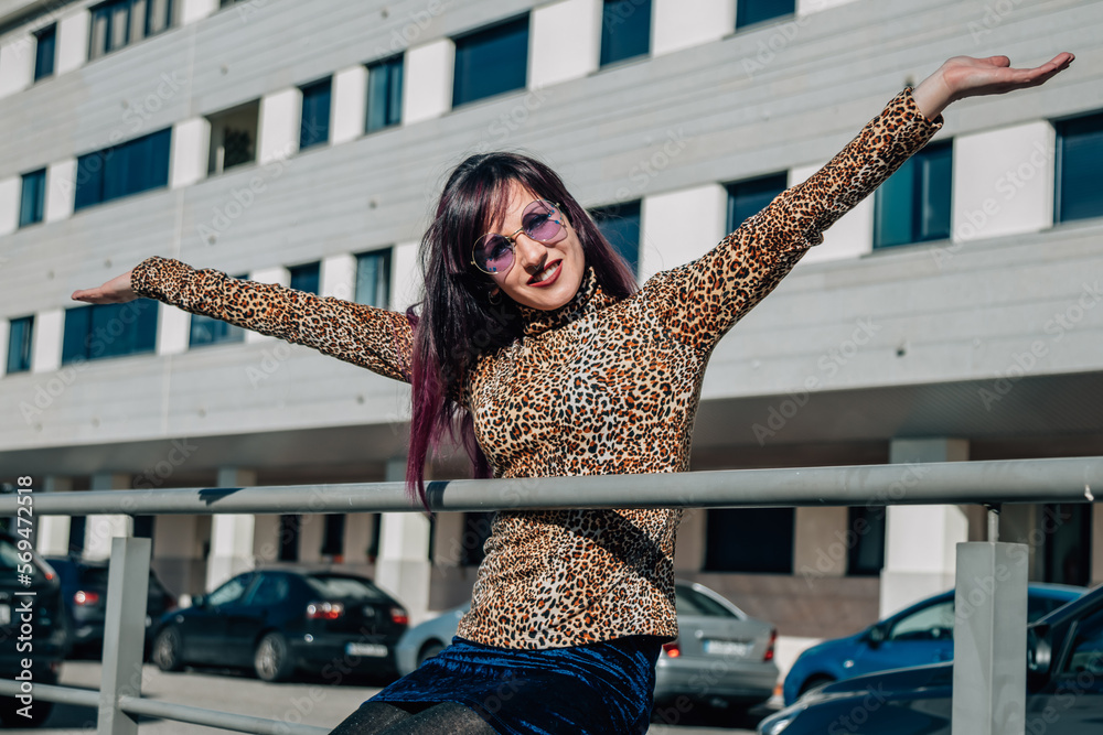 funny eighties young woman in retro glasses on the street