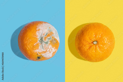 Rotten tangerine and fresh tangerine on blue and yellow background.