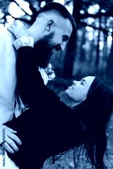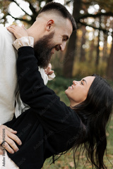 Happy young bearded man with his girlfriend are hugging in the park in warm Valentines day. Loving stylish Heterosexual couple having fun and looking each other on date in nature outdoors.