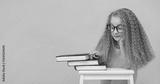 School education and literacy concept with cute little girl in glasses with curly hair bored with books stack isolated on background. Back to school. International children book day. Children's Day