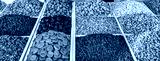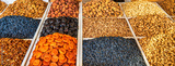 Oriental dried fruits and nuts on the counter of the bazaar.