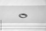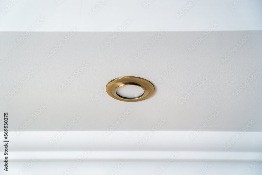 Golden round LED lamp isolated on a white ceiling.