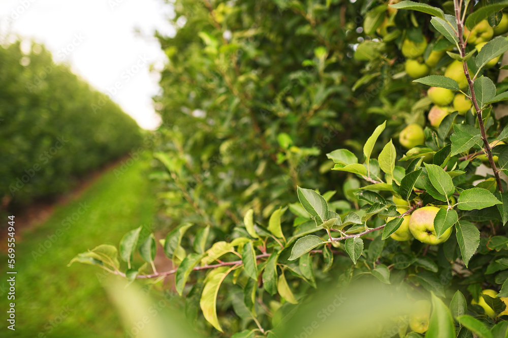 green ripe apples on the branches of apple trees in the orchard against the background of green grass and sky. Agriculture, harvest