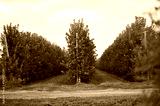 rows of apple trees in an apple orchard on a background of green grass and sky.